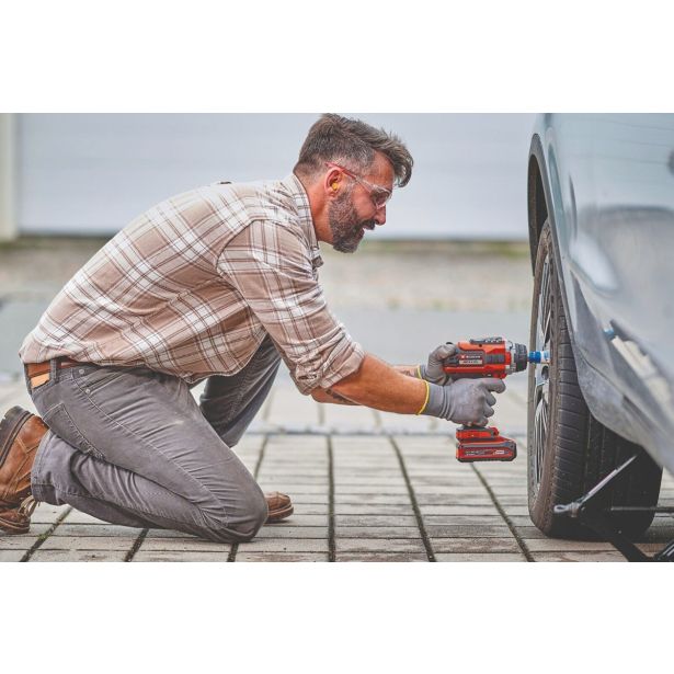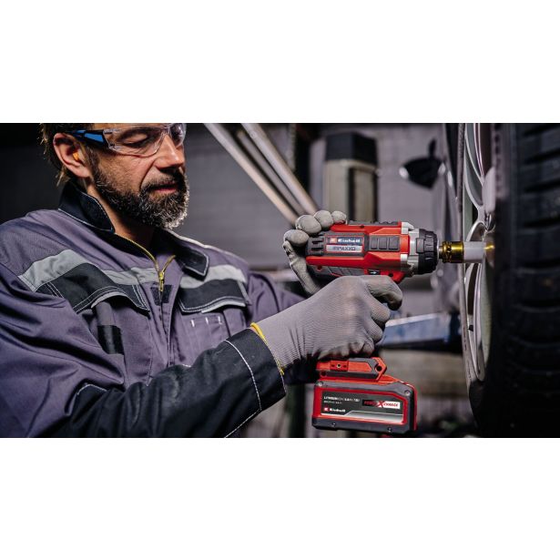 Enostavno sprostite ali zategnite tudi matice avtomobilskih koles zmogljiv akumulatorski udarni vijačnik Einhell IMPAXXO 18/400 ima brezogljični motor, robustno 1/2-palčno kvadratno vpenjalo in hitrost do 2100 vrtljajev na minuto