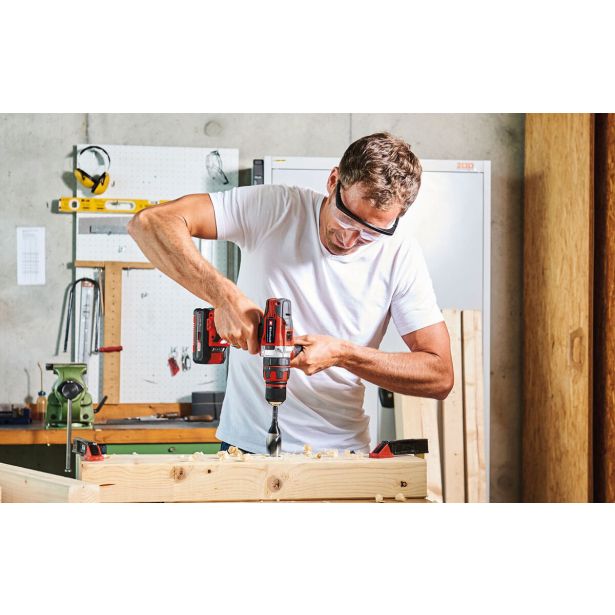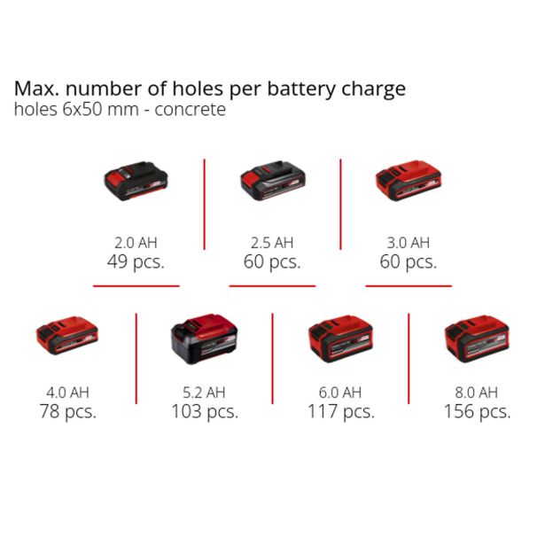 Akumulatorsko vrtalno kladivo Einhell TE-HD 18/20 Li se uporablja zaradi svojih štirih funkcij za udarno vrtanje, vrtanje in dletanje s fiksiranjem in brez njega. Pnevmatski udarni mehanizem zagotavlja močno udarno moč 1,8 J. Tako akumulatorsko vrtalno kladivo omogoča vrtanje lukenj s premerom do 20 mm v beton. Naprava doseže največjo število udarcev 4.750 min-1. Kljub veliki moči omogoča elektronika za hitrosti prilagodljivo delo glede na material in uporabo. Univerzalni nosilec orodja SDS-plus je opremljen s polavtomatskim delovanjem. Zaradi ergonomske oblike z mehkim oprijemom in dodatnim ročajem je vrtalnik tudi pri delu v trdnem materialu stabilen v roki. Akumulatorsko vrtalno kladivo je dodatno opremljen z LED-lučjo za optimalno osvetlitev delovnega območja in nastavljivim omejevalcem globine za natančno vrtanje. V paketu sta vključena dve 3,0 Ah Power X-Change Plus baterije in polnilnik.