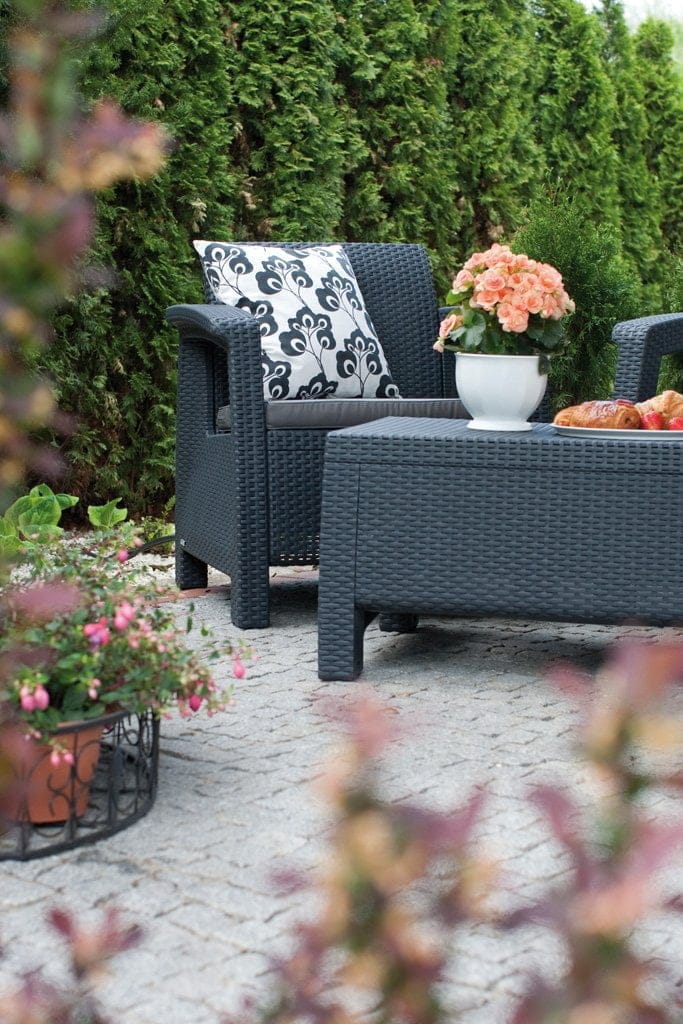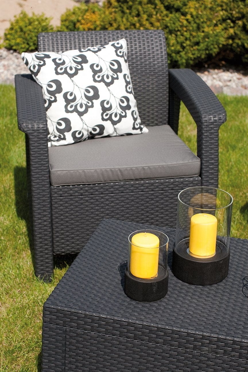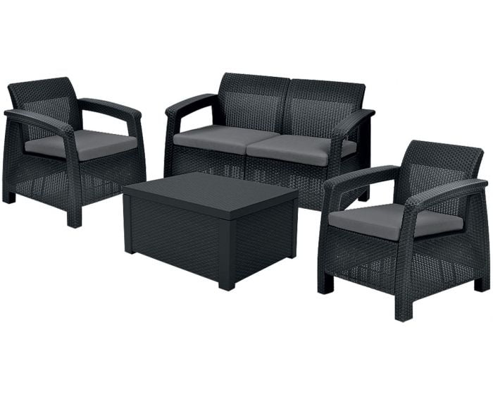 Corfu box je elegantna garnitura s teksturo ratana, sestavljajo jo dva naslonjača, dvosed, miza, ki ima funkcionalni prostor za shranjevanje blazin. Set vključuje tudi mehke, udobne blazine. Konstrukcija je lahko in udobna. Set je enostaven za čiščenje in odporen na vremenske vplive in UV žarke.