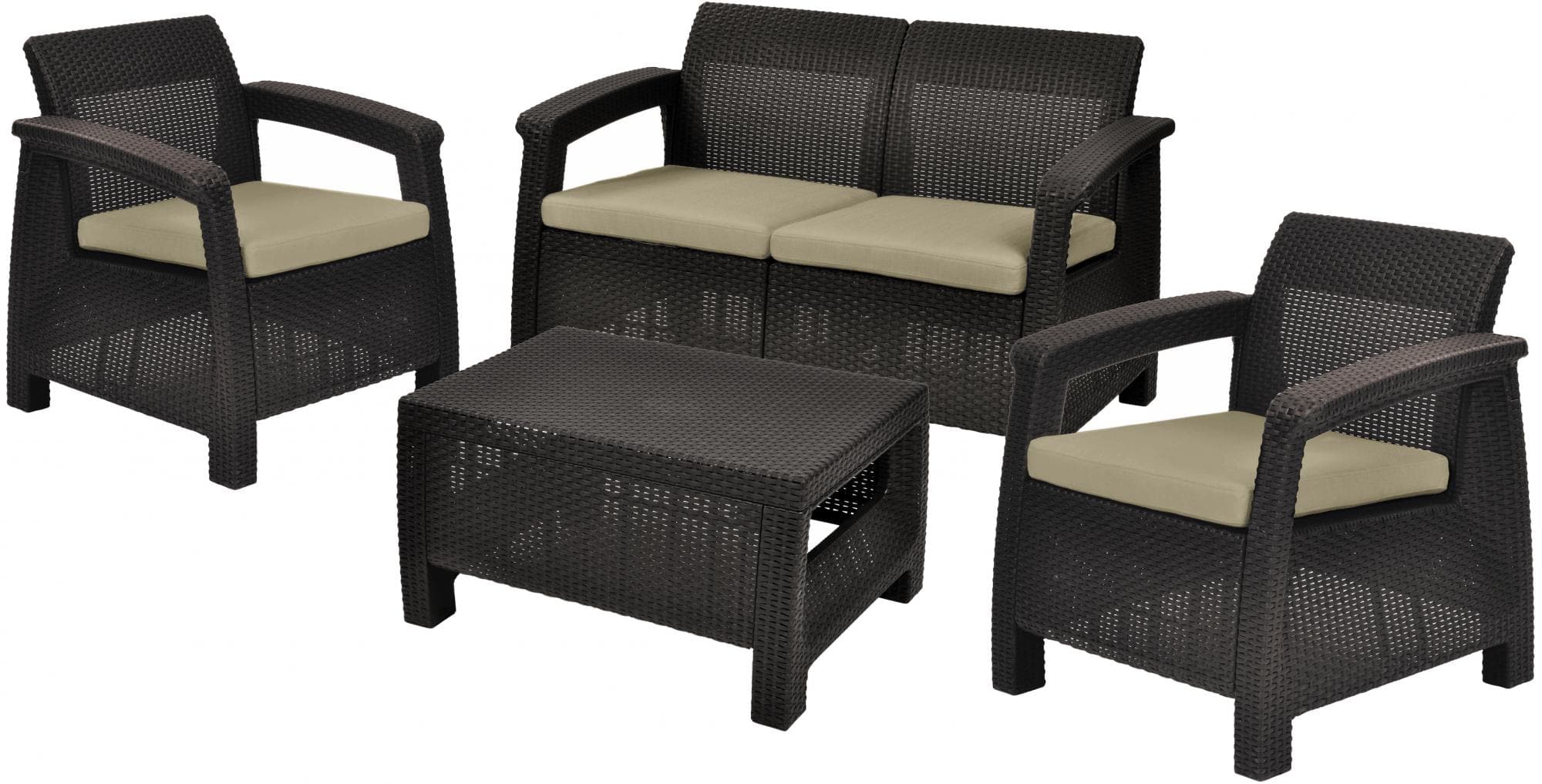 Allibert CorfuGarnitura vključuje dva fotelja, kavč in mizo iz umetnega ratana, pri katerem barve ne zbledijo. Enostavna namestitev in vzdrževanje. Material je odporen na različne vremenske vplive, vodo in UV sevanje. Garnituro dopolnjujejo udobne blazine. Priporočila: