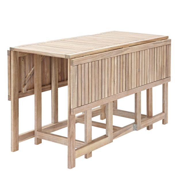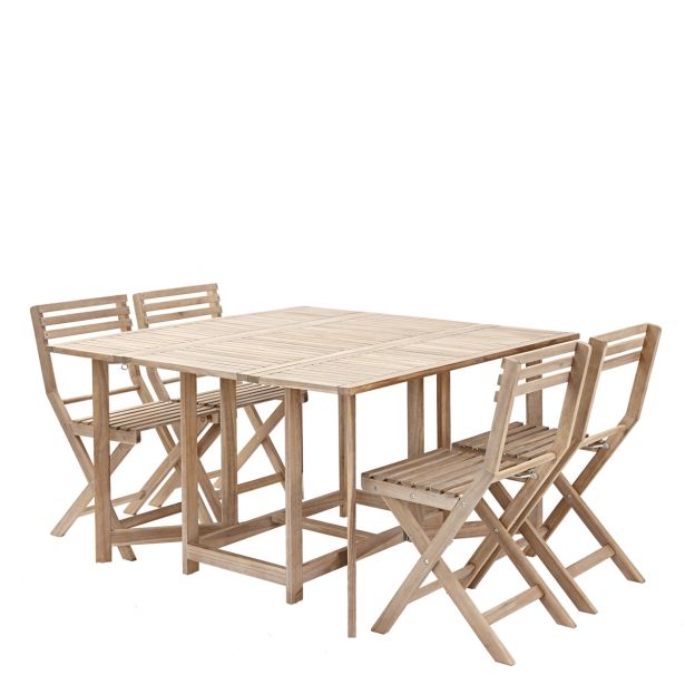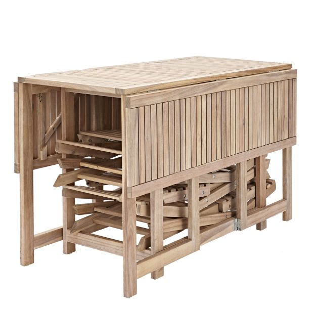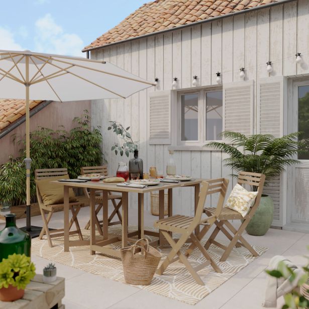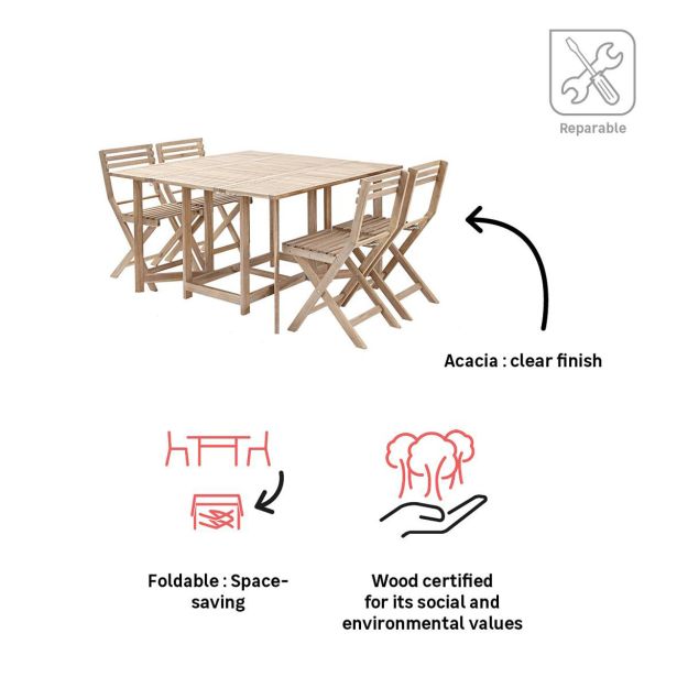 Miza in 4 kompaktni stoli Solis II sta popolna za majhne prostore, še posebej za balkone. Zasnovan za optimizirano uporabo, ta set ponuja funkcionalno jedilno območje za štiri osebe. Ko miza ni v uporabi, se lahko stranske strani mize zložijo, stoli pa se shranijo pod mizo, kar vam omogoči prihranek prostora. Debelina ojačanega akacijevega lesa zagotavlja večjo vzdržljivost pohištva, ki ga lahko uživate sezono za sezono.