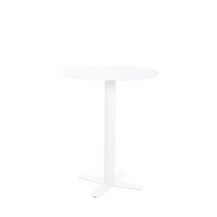 Barska miza BOGO. Miza je primerna za gostinske lokale, za notranjo kakor tudi zunanjo uporabo. Mizna plošča je narejena iz MDF v beli mat barvi. Mizno podnožje je iz kovine, prav tako v beli mat barvi.