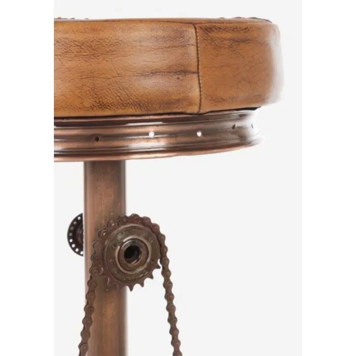Barski stol CYCLE je dobavljiv v rjavi barvi. Noga je kovinska z bakreno oblogo, sedež pa je oblečen v usnje.