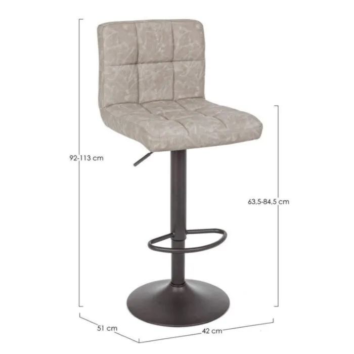 Barski stol GREYSON VINT svetlo siva ima okvir iz kovine, sedalni del je iz poliuretanske pene ki ima čez umetno usnje.