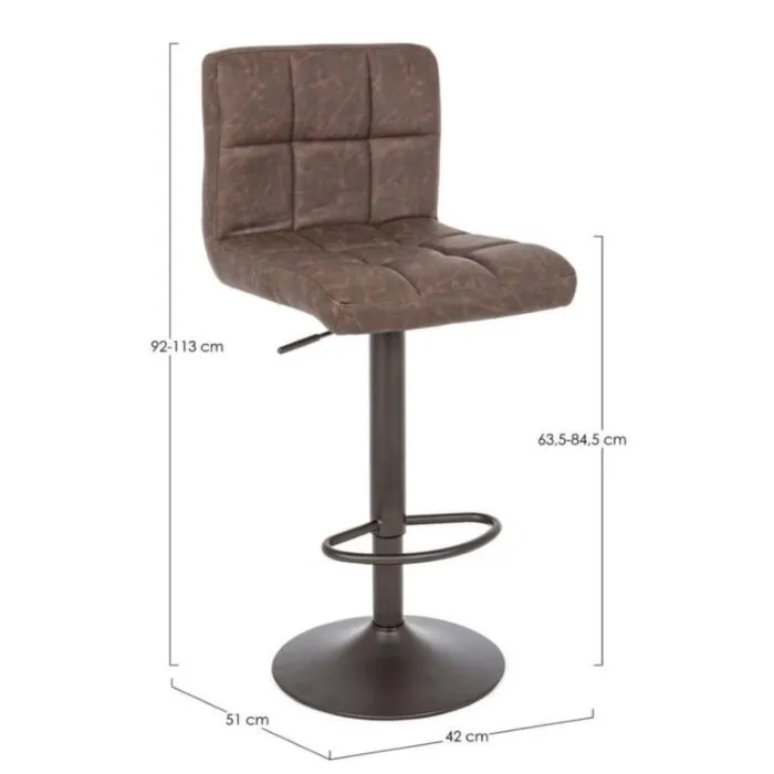 Barski stol GREYSON VINTAGE rjava ima okvir iz kovine, sedalni del je iz poliuretanske pene ki ima čez umetno usnje.