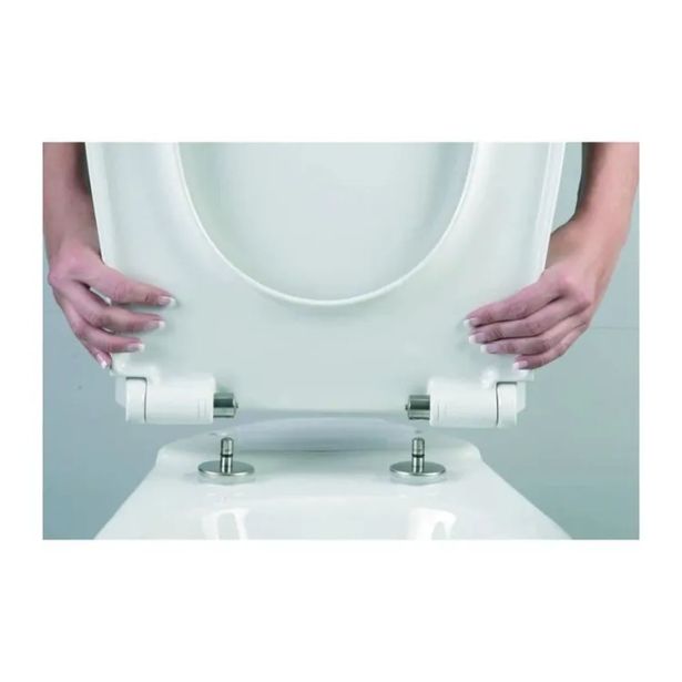 Deska za straniščno školjko iz duroplasta univerzalne oblike, bele barve, počasno zapiranje, tečaji so iz nerjavečege jekla. Deska ima funkcijo “take off” – deska se enostavno sname skupaj s pokrovom za popolno čiščenje wc školjke.