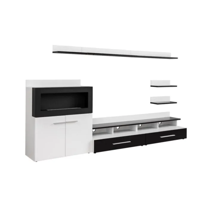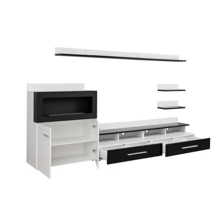 Dnevni regal NOEL 2 bo popestril vsako dnevno sobo. Vrata omaric se odpirajo s push-click sistemom. Komoda ima bio kovinski kamin. Izdelan je v EU.