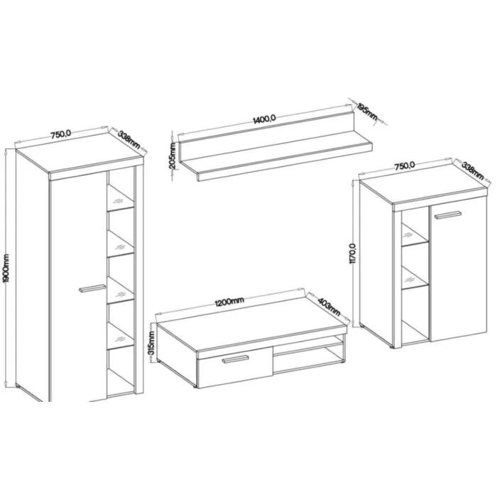 – Polica: D: 140 cm x V: 20,5 cm x G: 19,5 cm