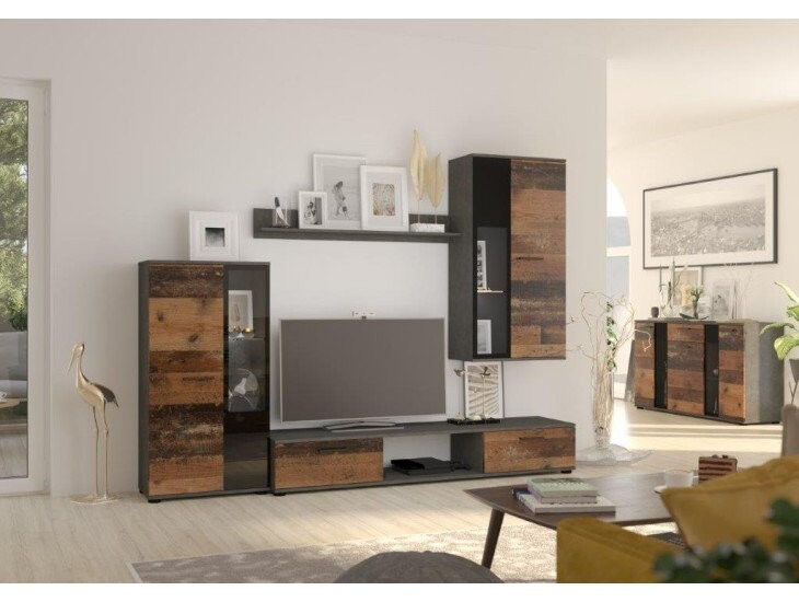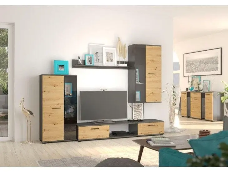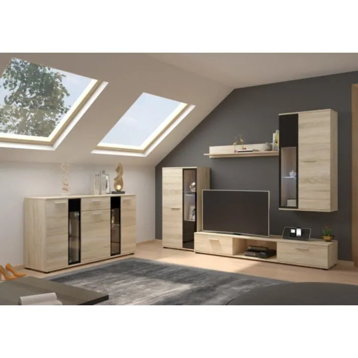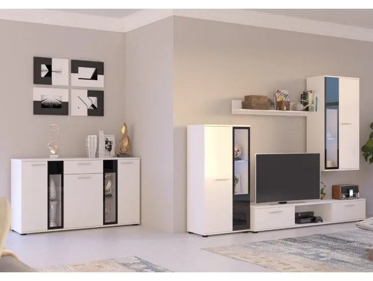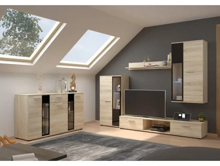 Dnevni regal vsebuje 1 x polico, 1 x visečo vitrino, 1 x normalno vitrino, 1 x TV regal ter 1 x komodo. Dostopen je v več barvah.