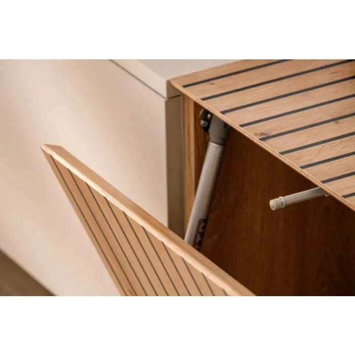 Dnevni regal SOLE je modernega dizajna. Kombinacija preprostega in privlačnega dizajna se bo podal v vsak prostor. Narejen je iz kvalitetne iverne plošče. Plošča v barvi artisana ima detajle črnih tiskanih črt.