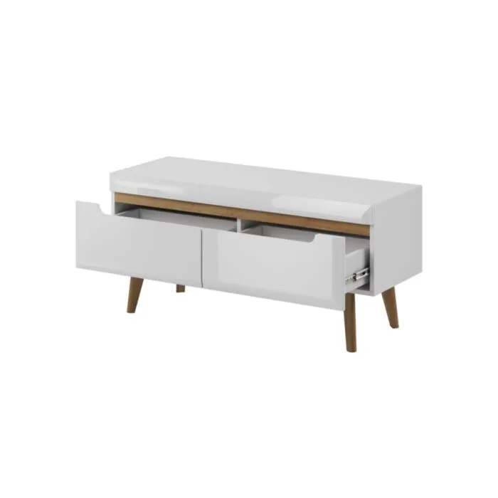 Dnevni tv regal s stilom skandinavskega sloga. Dobavljiv je v bela mat/bela visoki sijaj. Hrastove lesene noge, ABS robovi, vrata(ličnice) so MDF. Lahko ga kombinirate z ostalimi deli iz serije RON.