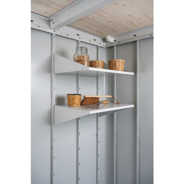 2 Police. Dodatki iz pocinkanega jekla, prevlečeni z belo sivo barvo.Dimenzije: standardni: 56 x 26 x 17.3 cm (D x Š x G).