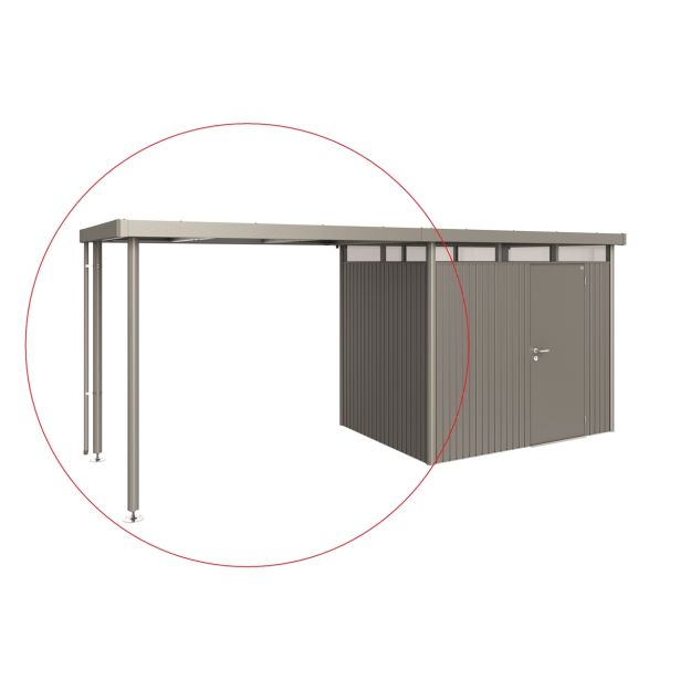 Stranski nadstrešek lahko pritrdite na vrtno hiško HighLine (od velikosti H2 naprej) na stran z žlebom – na eni ali obeh straneh – ne glede na to, katera možnost najbolje ustreza vašim zahtevam. To ustvarja pokrit odprt prostor enak enojni / dvojni površini vrtne hiške. Aluminijaste opore so opremljene z nastavljivo višino. Vključena je cev za deževnico.