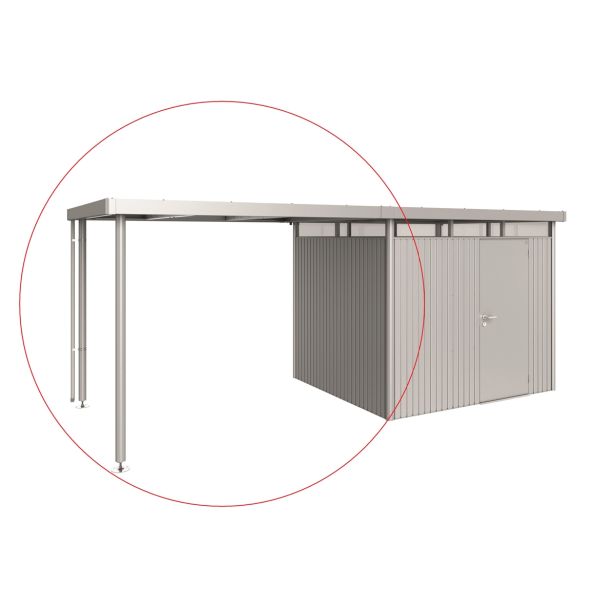 Stranski nadstrešek lahko pritrdite na vrtno hiško HighLine (od velikosti H2 naprej) na stran z žlebom – na eni ali obeh straneh – ne glede na to, katera možnost najbolje ustreza vašim zahtevam. To ustvarja pokrit odprt prostor enak enojni / dvojni površini vrtne hiške. Aluminijaste opore so opremljene z nastavljivo višino. Vključena je cev za deževnico.