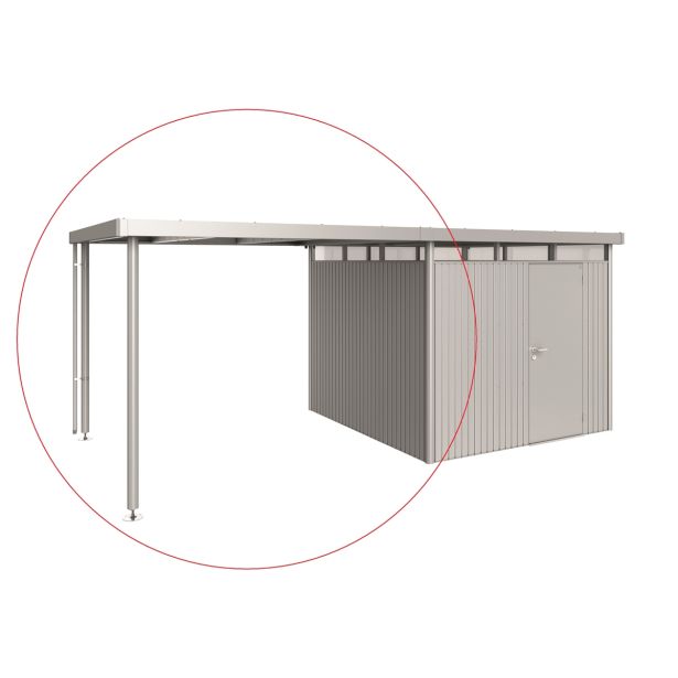 Stranski nadstrešek lahko pritrdite na vrtno hiško HighLine (od velikosti H2 naprej) na stran z žlebom – na eni ali obeh straneh – ne glede na to, katera možnost najbolje ustreza vašim zahtevam. To ustvarja pokrit odprt prostor enak enojni / dvojni površini vrtne hiške. Aluminijaste opore so opremljene z nastavljivo višino. Vključena je cev za deževnico.
