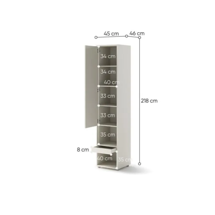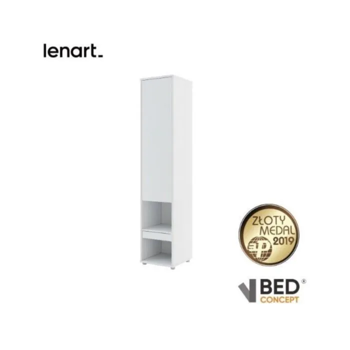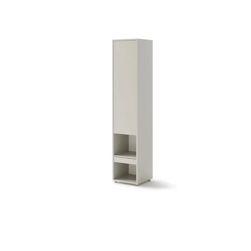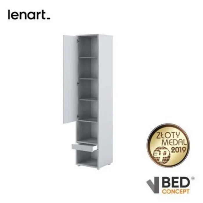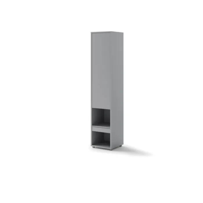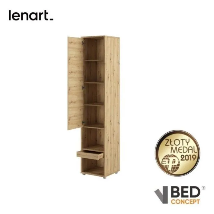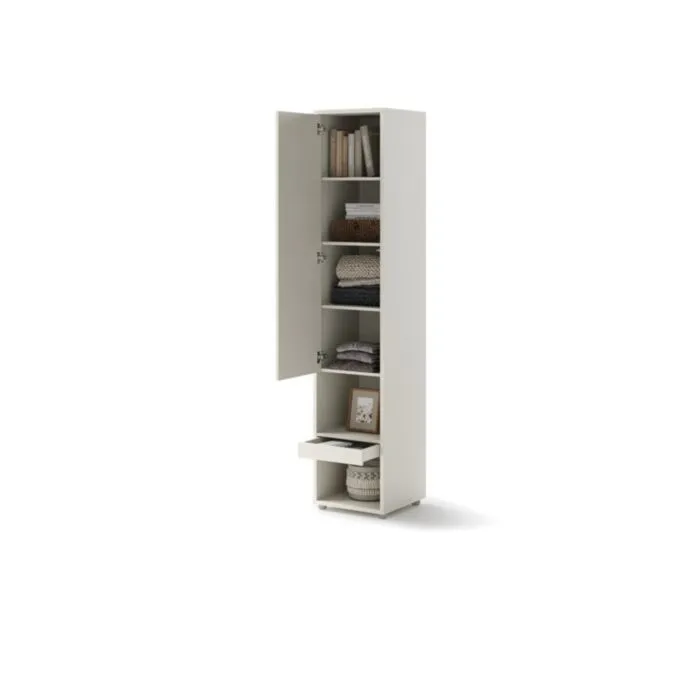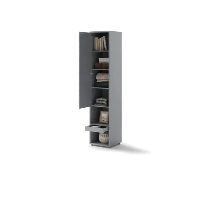 Visoka, navpična omara za knjige z vrati, dvema vdolbinama in predalom, je na voljo v različnih barvah. Popolna je za shranjevanje vseh stvari in pri tem zavzame malo prostora. Knjižna omara je odličen dodatek za postelje v omari iz zbirke METULJ. Izdelana je iz laminirane plošče. Ima ABS robove, ki zagotavljajo večjo odpornost proti udarcem, vlagi in obrabi ter podaljšujejo njeno življenjsko dobo. ABS robovi ne le ščitijo pred poškodbami, ampak poskrbijo tudi za lepši in elegantnejši videz pohištva. Ima 5 polic, 1 predal ter 1 vrata. Ima mehko zapiranje ter odpira se s sistemom push to open