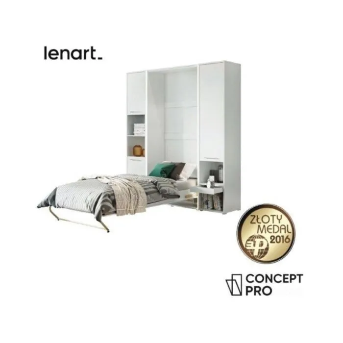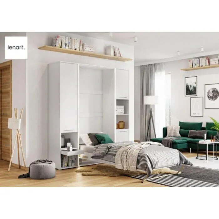 Visoka, navpična stenska polica je v navpični izvedbi. Knjižna polica je opremljena z omarico, ki jo je mogoče zakleniti, dvema policama in praktičnim predalom. Ergonomska funkcionalna delitev omogoča udobno shranjevanje oblačil in manjših predmetov ter razstavljanje knjig ali okraskov. Zahvaljujoč policam je uporaba stenske postelje METULJ PRO še bolj udobna in bolj podobna tradicionalni spalnici.