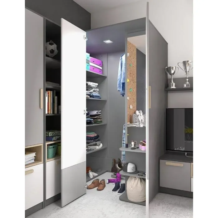 Dvokrilna garderobna omara SIVKO – leva je omara z dvema prečkama, knjižna polica s policami, toaletna miza in samodejna LED osvetlitev.