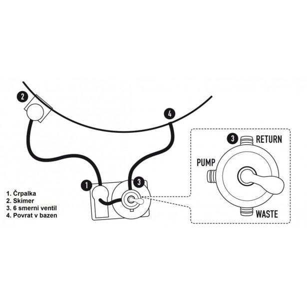 Opremljen je s sesalno črpalko, ki jo je potrebno namestiti pod vodno gladino (pri vgrajenih bazenih ne sme stati nad gladino vode). Rokovanje s 6 potnim ventilom je enostavno in nudi udobje in nastavitve kot pri modelih višjega cenovnega razreda. Čas delovanja naprave je odvisen od velikosti ? volumna vode v bazenu, lege, vremena, obremenitve bazena s kopalci in dodajanja sredstev za nego vode.Praviloma naj bi se vsebina bazena ? voda v 24 urah prefiltrirala 1 ? krat. Primer: če želimo 1 ? krat prefiltrirati vodo v bazenu volumna 10 m? je potrebno prefiltrirati 15 m? vode. Če ima črpalka pretok 4 m?/h mora delovati 3,75 ure. Svetujemo vam, da v tem primeru filtrirna naprava deluje 3 krat na dan po 1,25 ure.