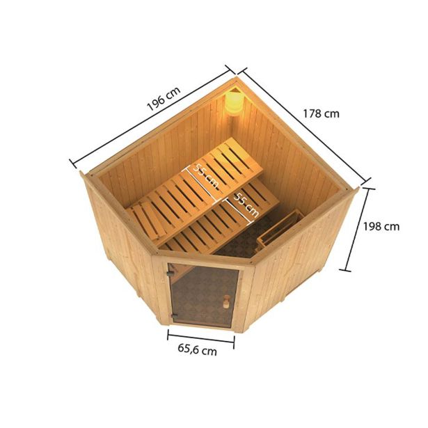 Z zunanjimi 196 x 178 cm in notranjimi 181 x 164 cm ponuja kompaktni Bodo dovolj prostora za sprostitev. Dve klopi za savno dimenzij 55 x 181 cm ponujata udoben prostor za 2-4 osebe. V obsegu dobave je tudi zaščitna rešetka za pečico.