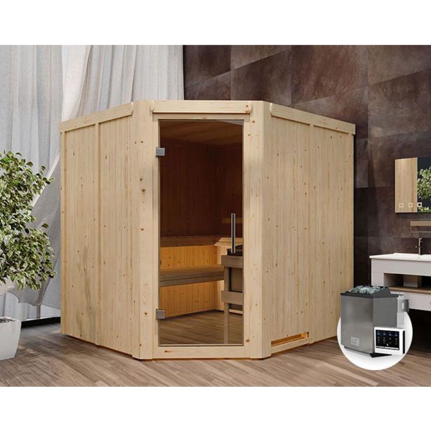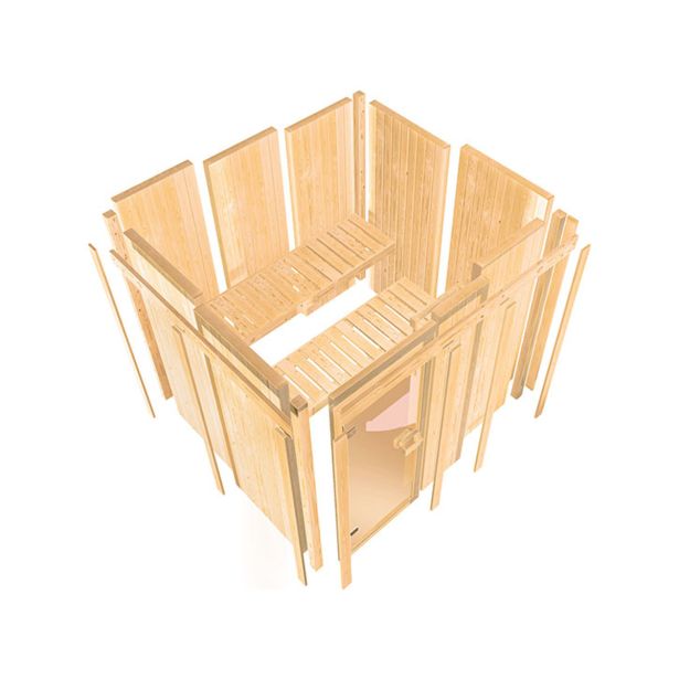 68 mm sistemska savna Jarin proizvajalca Karibu z kotnim vstopom je odlična za 2-4 osebe . Na treh velikih klopeh za savno s površino 57 ali 52 x 181 cm se lahko udobno sprostite v paru ali manjši skupini.