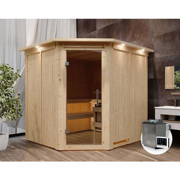 68 mm sistemska savna Jarin proizvajalca Karibu z kotnim vstopom je odlična za 2-4 osebe . Na treh velikih klopeh za savno s površino 57 ali 52 x 181 cm se lahko udobno sprostite v paru ali manjši skupini.