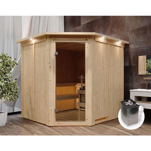 68 mm sistemska savna Jarin proizvajalca Karibu z kotnim vstopom je odlična za 2-4 osebe . Na treh velikih klopeh za savno s površino 57 ali 52 x 181 cm se lahko udobno sprostite v paru ali manjši skupini.