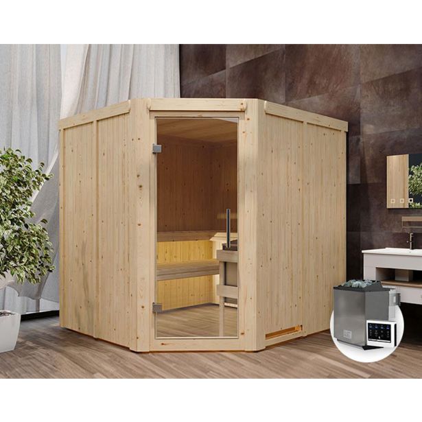 68 mm sistemska savna Jarin proizvajalca Karibu z kotnim vstopom je odlična za 2-4 osebe . Na treh velikih klopeh za savno s površino 57 ali 52 x 181 cm se lahko udobno sprostite v paru ali manjši skupini.