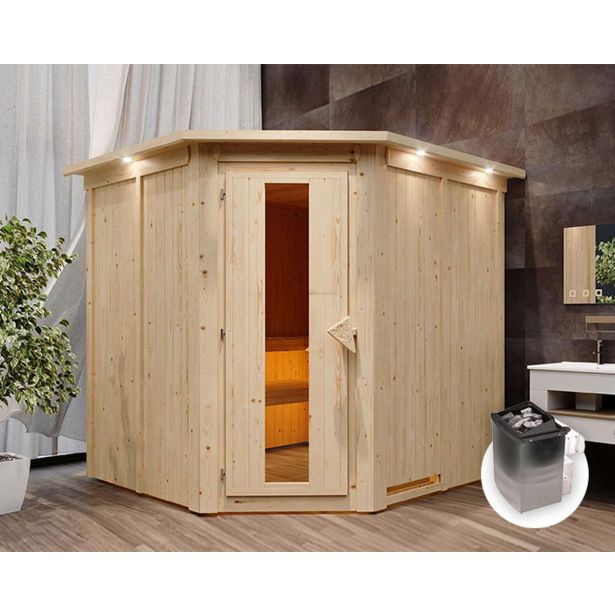 68 mm sistemska savna Jarin proizvajalca Karibu z kotnim vstopom je odlična za 2-4 osebe. Na treh velikih klopeh za savno s površino 57 ali 52 x 181 cm se lahko udobno sprostite v paru ali manjši skupini.