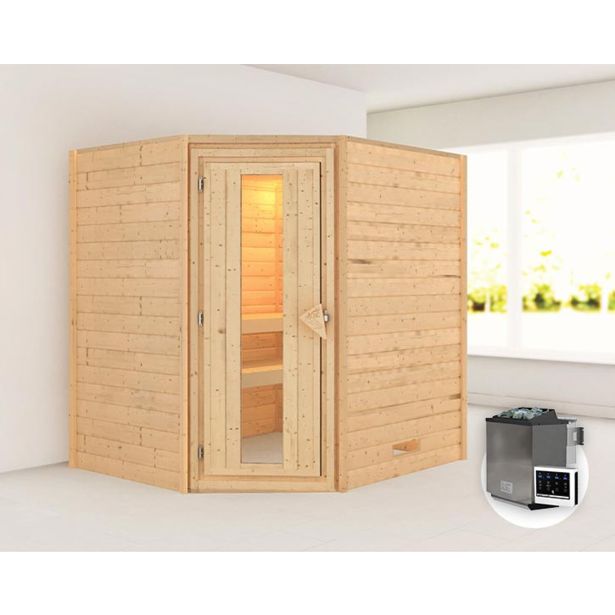 Savna na polena Karibu Mia vklj. 9 kW biogrelnik in zunanjo regulacijo brez strešnega roba z lesenimi vrati in izolacijskim steklom, toplotno izolirana.