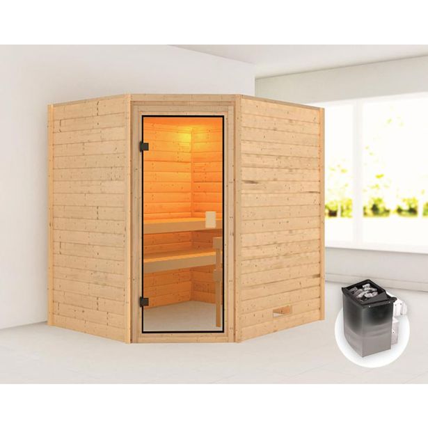 Savna Karibu Mia s pečico 9 kW in integriranim krmiljenjem brez strešnega roba z bronastimi steklenimi vrati
