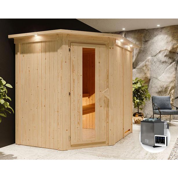 Udobna 68mm element savna z kotnim vstopom, 2 ležalnikoma in 9kW bio-kombi grelnikom z zunanjim upravljanjem. Udoben prostor za 2-4 osebe
