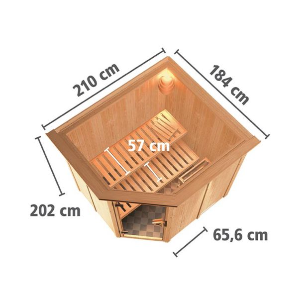 – V notranjosti boste našli veliko osnovne opreme, vključno z 2 klopmi širine 58 cm iz kakovostnega topolovega lesa, 1 vzglavnikom iz masivnega topolovega lesa in ščitnikom za peč iz smreke.