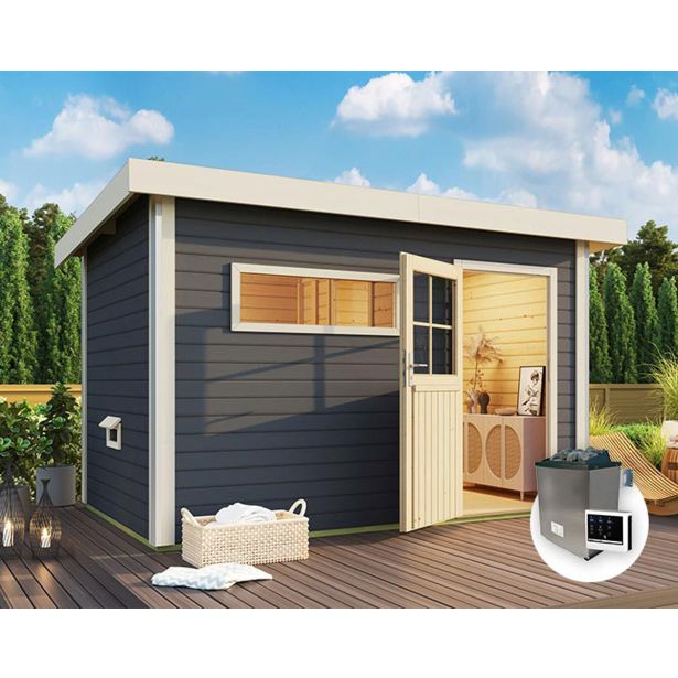 Vrtna savna Karibu Skrollan 3 je opremljena s predsobo in 9kW grelcem. Ima 38mm debelo konstrukcijo, enokapno streho ter klasična vrata v terra grey barvi. Idealna za sprostitev.