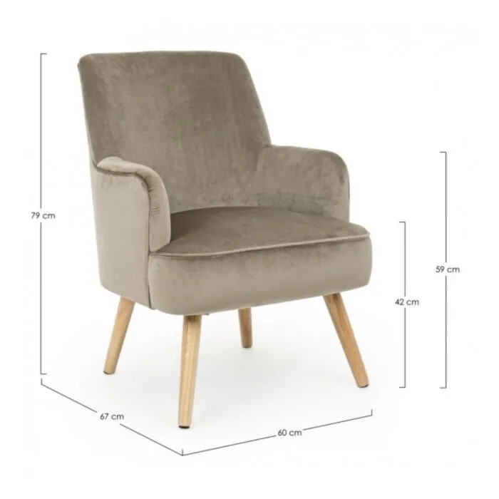 Fotelj ADELINE taupe je narejen iz borovega lesa in MDF-ja, noge so iz hrastovega lesa, prevleka je iz poliestra z učinkom žameta.