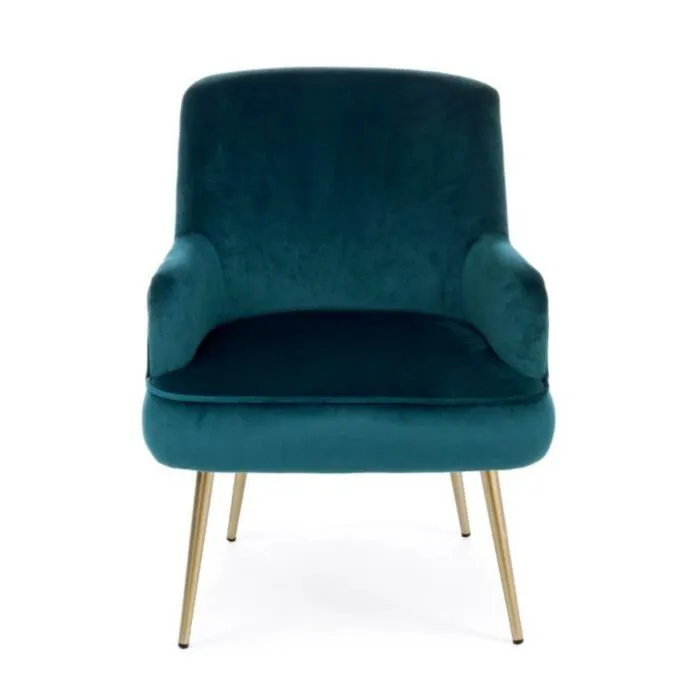 Fotelj CLELIA modra ima strukturo iz borovega lesa, noge so v zlati barvi. Prevleka je iz poliestra ki oddaja žametni učinek. Obloga je iz poliuretanske pene.