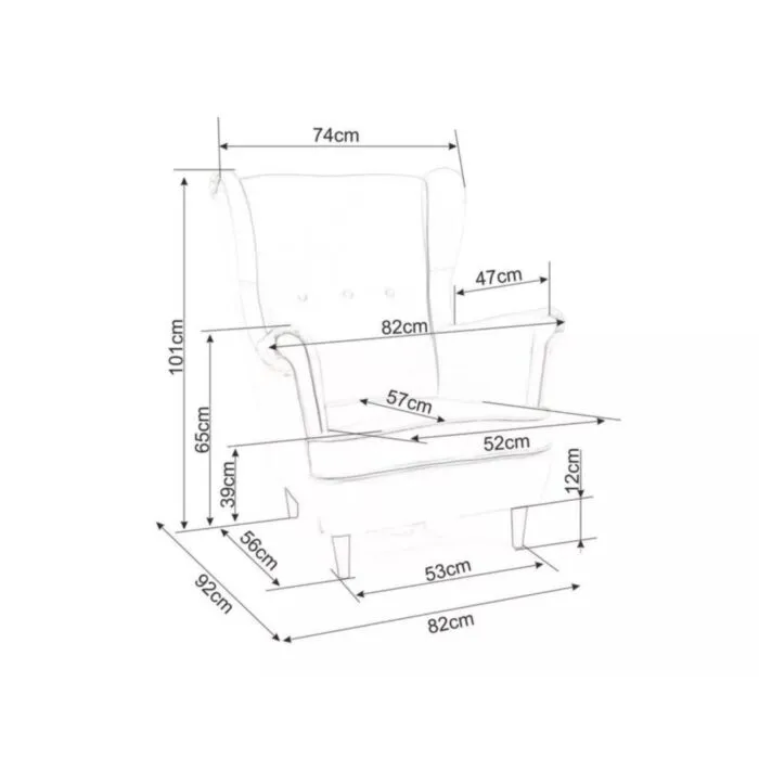 Sedišče in naslon sta mehka ter udobna, kar zagotavlja mehka pena. Nogice so iz lesa barvane v wenge barvo, sedež pa je iz udobnega blaga. Visoki rokonasloni pripomorejo k še večji udobnosti in eleganci.
