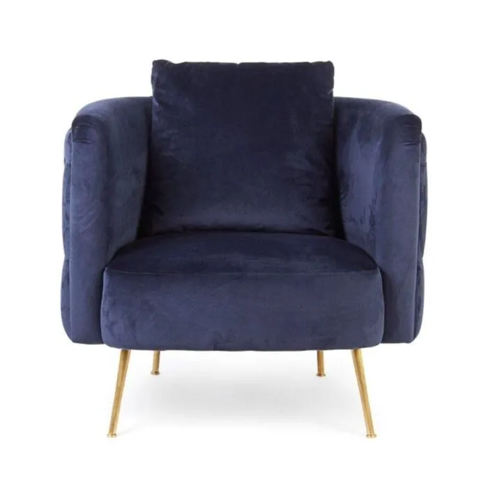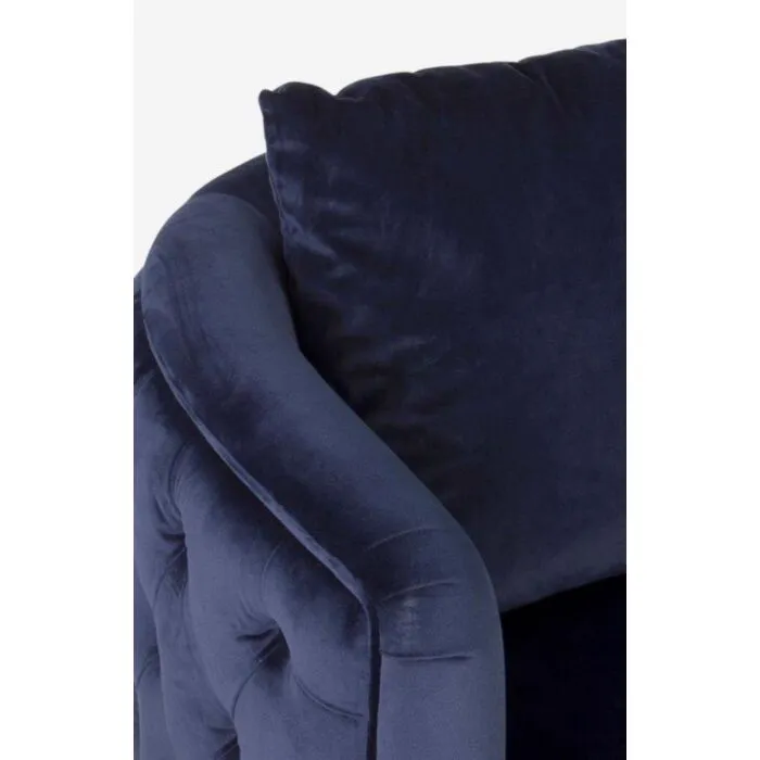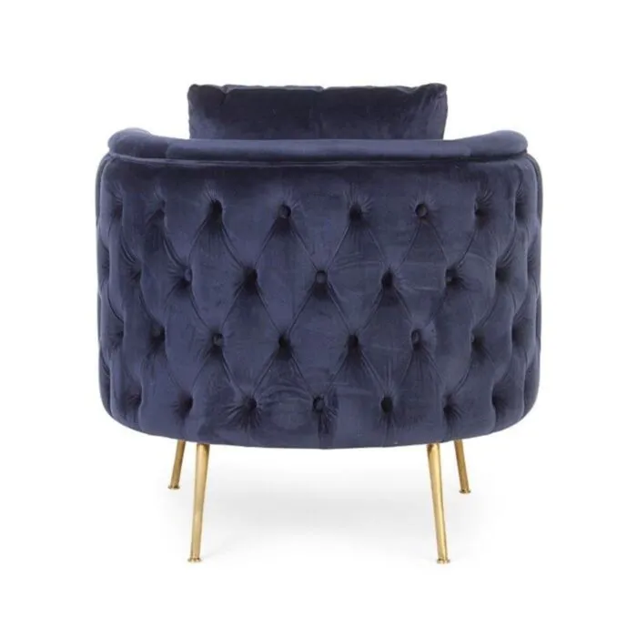 Fotelj TIFFANY temno modra je narejen iz kovine. Prevleka je iz poliestra, ki daja žametni učinek, strukturo ima iz lesa. Hrbtna blazina je odstranljiva, obloge so narejene iz poliuretanske pene.