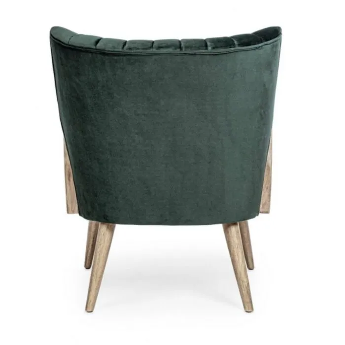 Fotelj VIRNA zelena ima žametni učinek. Okvir je iz borovega lesa in polnjen je z peno. Naslonjala za roke so z vložki iz ratana in prevleka je iz poliestra.