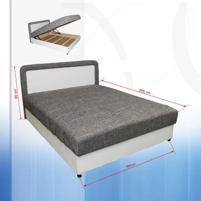 Udobna in kvalitetna postelja KARMEN vam zagotavlja miren spanec. Je dvižna, ima velik predal za shranjevanje vaših stvari. Ležišče je vzmeteno, višina vzglavne stranice je 90 cm. Podnožje postelje je belo umetno usnje, ležišče pa v trpežni tkanini sive barve. Zaradi njene kvalitete vam bo služila mnogo let.