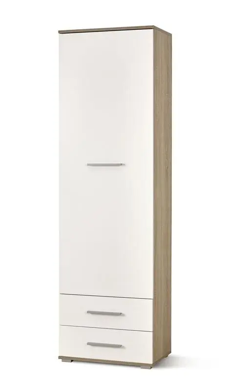 Garderobna omara ALMA je zelo stabilna in kvalitetna. Primerna je za vsak prostor. Omara je narejena iz laminirane plošče z ABS robovi. Korpus je v barvi hrast sonoma/ fronte pa so v beli barvi visoki sijaj in v barvi hrast sonoma visoki sijaj.