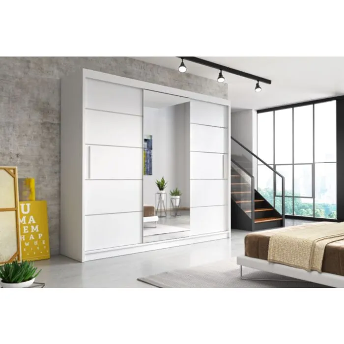 Garderobna omara BALI je primerna za vsako spalnico. V notranjosti leve in desne omare so police, v sredini pa je polica, ter palica za obešalnike.  Narejena je iz laminirane plošče debeline 16 mm z ABS robovi. Korpus omare je v beli barvi, fronta pa v beli barvi mat ali barvi hrast sonoma.