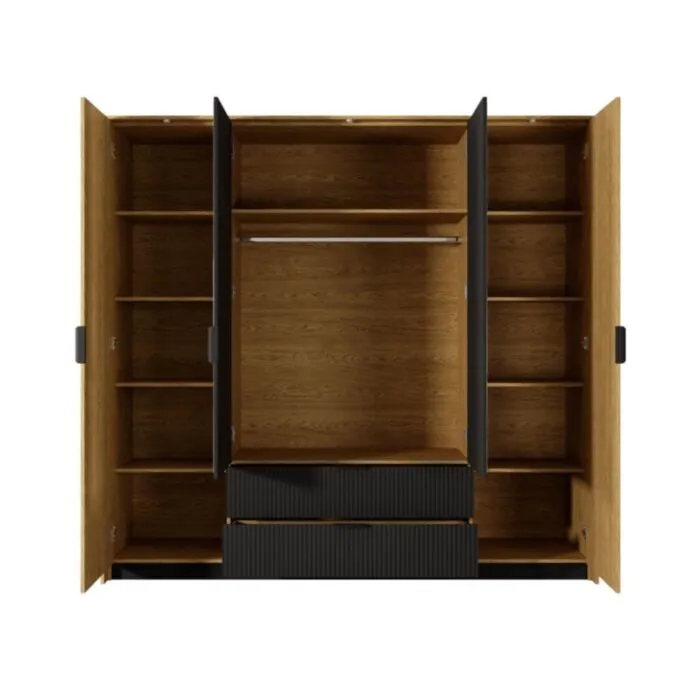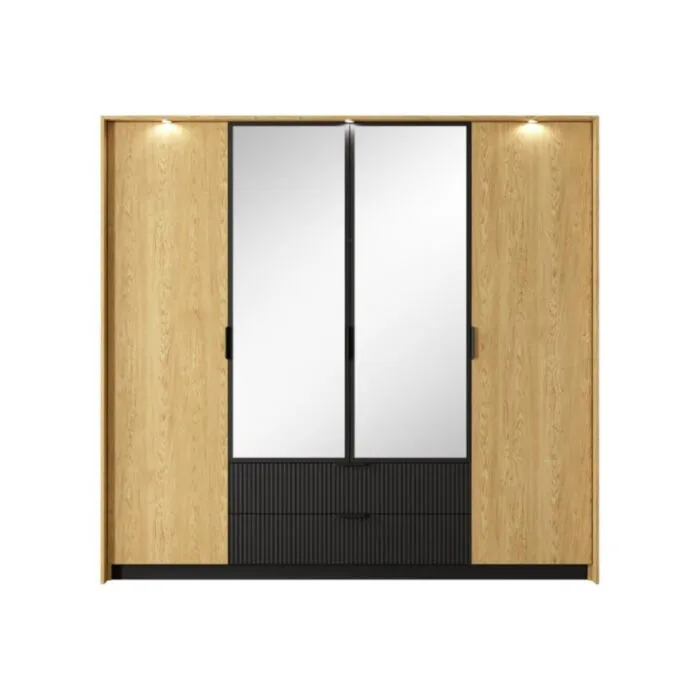 Elegantna in moderna garderobna omara BILI je narejena iz odličnih materialov v barvi hrasta s kombinacijo črne. Narejena je iz kakovostnega MDF-ja in ima ABS robove, ki zagotavljajo večjo odpornost proti udarcem, vlagi in obrabi ter podaljšujejo njeno življenjsko dobo. ABS robovi ne le ščitijo pred poškodbami, ampak poskrbijo tudi za lepši in elegantnejši videz pohištva. Vsebuje mehko zapiranje in ima tudi LED razsvetljavo.