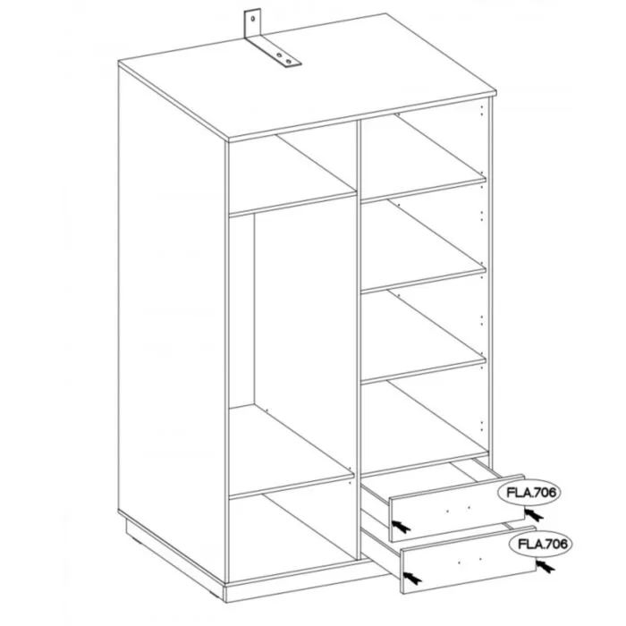 Garderobna omara FAJA 2 je prostorna in kvalitetna. Sestavljajo jo dve krili in dva predala. Levo krilo ima dve polici, desno pa tri.