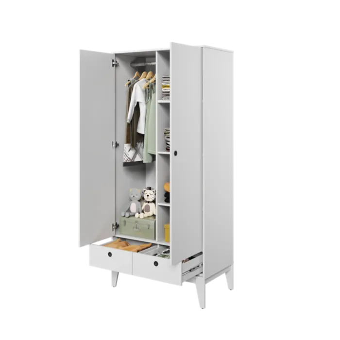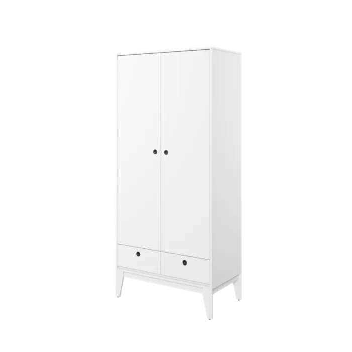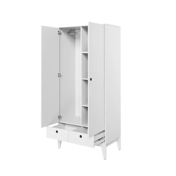 Garderobna omara FAMA je narejena iz trpežne laminirane plošče s ABS robovi. Dobavljiva je v beli barvi s črnimi ročkami. Vsebuje dva predala, tri police ter palico za obešanje oblačil.