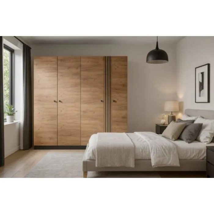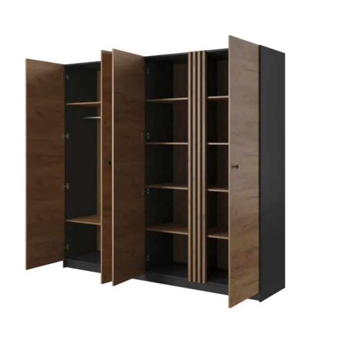 Garderobna omara GALIJA vas bo očarala s svojimi toplimi barvami skandinavskega hrasta v kombinaciji s kontrastno antracit barvo, ki bodo vašo spalnico naredile prostor blizu narave. Garderobna omara GALIJA je narejena iz kvalitetne laminirane plošče z ABS robovi ter ima črno/zlate ročaje.