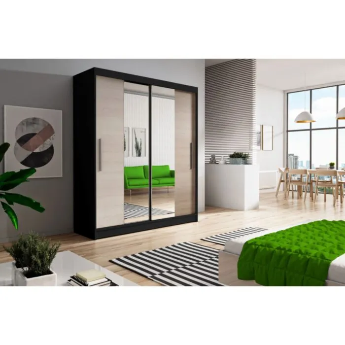 Garderobna omara GEA 3 je primerna za vse spalnice. Je zelo prostorna. Na levi strani ima zelo prostorne police, na desni strani pa je ena polica in palica za obešalnik. Omara ima drsna vrata. Na vratih je ogledalo. Korpus omare je v črni barvi, fronta je lahko v beli mat barvi ali barvi hrast sonoma  Narejena je iz laminirane plošče debeline 16 mm.