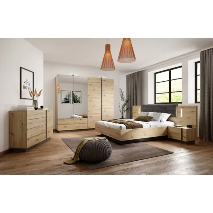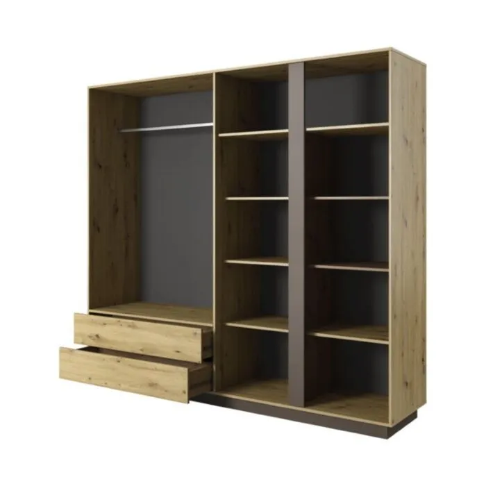 Elegantna in moderna garderobna omara JELENA je narejena iz odličnih materialov v grafitno sivem / hrast dekorju. Ena stran omare vsebuje dva ogledala ter spodaj dva predala. Druga stran omare pa vsebuje police.
