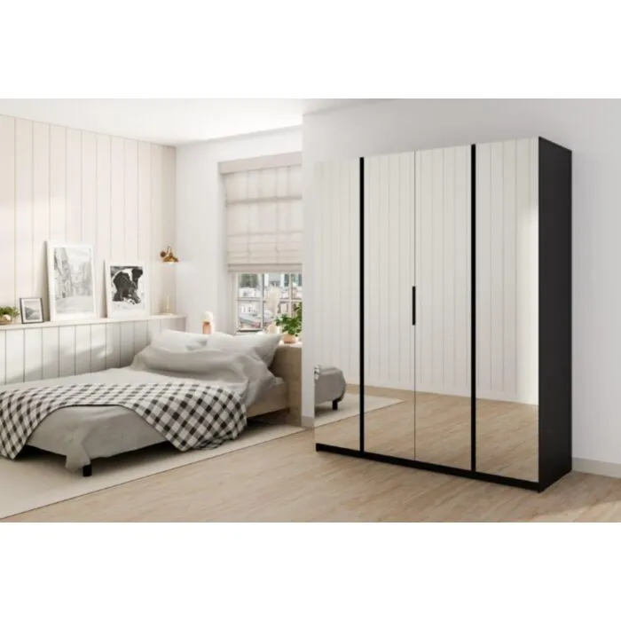 Garderobna omara KALINA 2 200 cm ima moderen dizajn. Narejena je iz laminirane plošče debeline 16 mm. Stranice so v črni barvi, na vseh frontah pa je ogledalo.