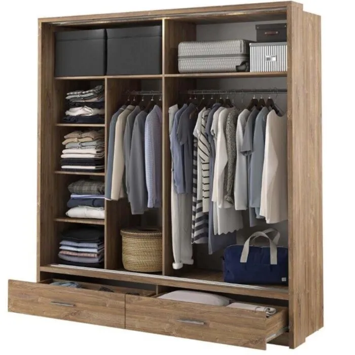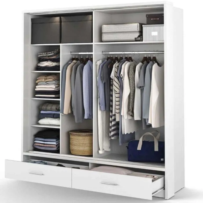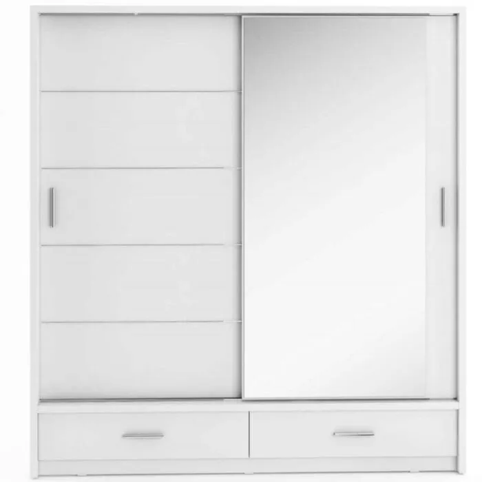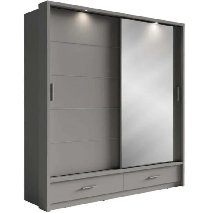Garderobna omara KREŠO 5 je omara s dvemi drsnimi vrati, dvema predaloma in vgrajeno osvetlitvijo. Ima visoko ogledalo katero je primerno za vsak prostor. Notri ima 2 prečki za obešalnike, stojalo za oblačila ter prostorne zgornje police. Na dnu sta dva globoka zunanja predala.